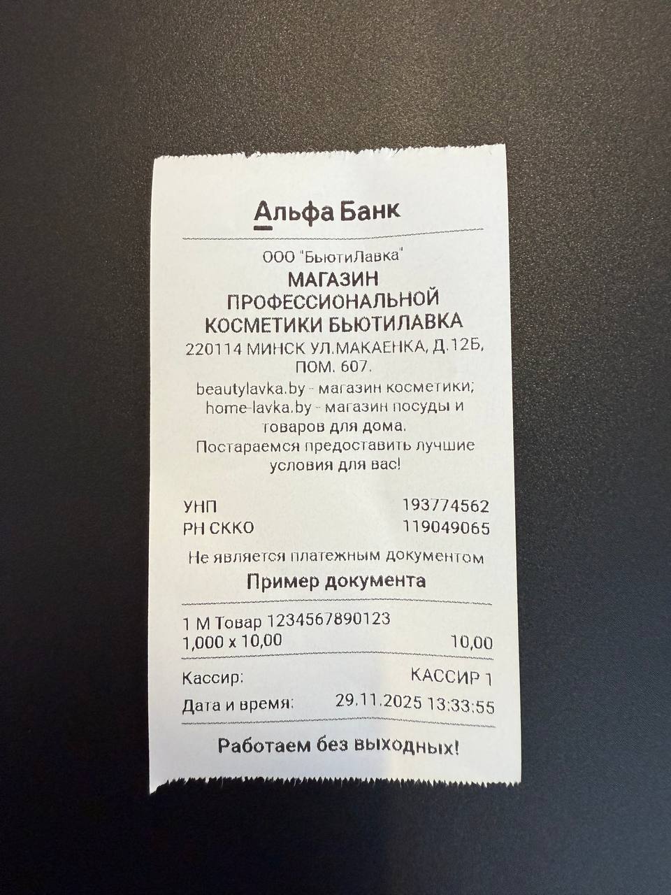 Образец чека, поставляемый с товаром: